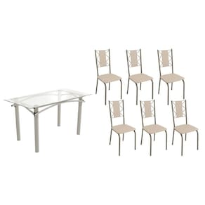 Sala de Jantar Completa Elba c/ Tampo de Vidro 150cm e 6 Cadeiras Lisboa Niquel - Courano Bege - Kappesberg Abaixo segue os produtos do KIT: Sala de Jantar Completa Elba c/ Tampo de Vidro 150cm e 6 Cadeiras Lisboa Niquel - Courano Bege - Kappesberg