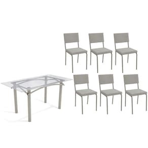 Sala de Jantar Completa Elba c/ Tampo de Vidro 150cm e 6 Cadeiras Zaria Niquel - Boucle Cinza - Kappesberg Abaixo segue os produtos do KIT: Sala de Jantar Completa Elba c/ Tampo de Vidro 150cm e 6 Cadeiras Zaria Niquel - Boucle Cinza - Kappesberg