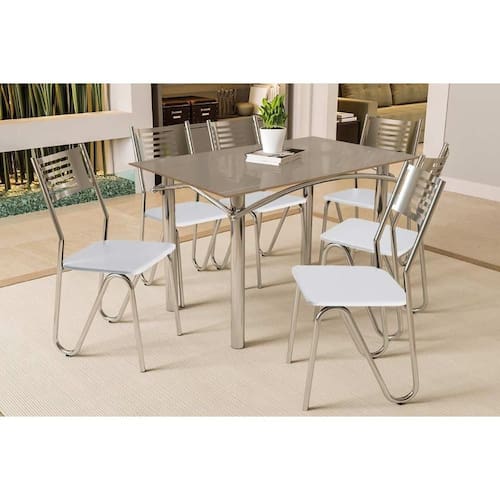 Sala de Jantar Completa Elba Tampo Madeirado c/ Vidro 120cm e 6 Cadeiras Nápoles Cromada/Freijo Bronze - Courano Branco - Kappesberg Abaixo segue os produtos do KIT: Sala de Jantar Completa Elba Tampo Madeirado c/ Vidro 120cm e 6 Cadeiras Nápoles Cromada/Freijo Bronze - Courano Branco - Kappesberg