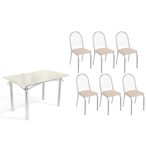 Sala de Jantar Completa Elba Tampo Madeirado c/ Vidro 120cm e 6 Cadeiras Noruega Cromada/Off White - Courano Bege - Kappesberg Abaixo segue os produtos do KIT: Sala de Jantar Completa Elba Tampo Madeirado c/ Vidro 120cm e 6 Cadeiras Noruega Cromada/Off White - Courano Bege - Kappesberg
