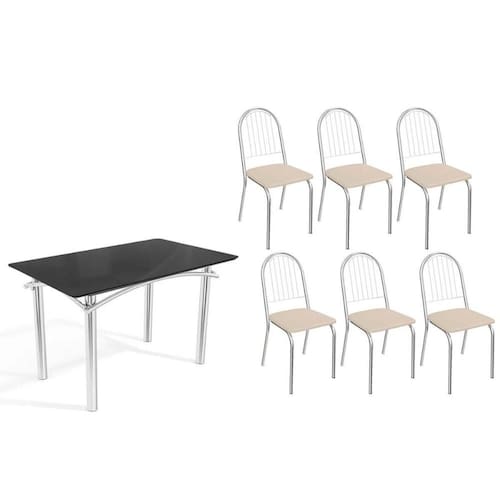 Sala de Jantar Completa Elba Tampo Madeirado c/ Vidro 120cm e 6 Cadeiras Noruega Cromada/Preto - Courano Bege - Kappesberg