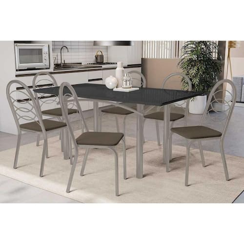 Sala de Jantar Completa Elba Tampo Madeirado c/ Vidro 160cm e 6 Cadeiras Holanda Niquel/Preto - Courano Marrom - Kappesberg