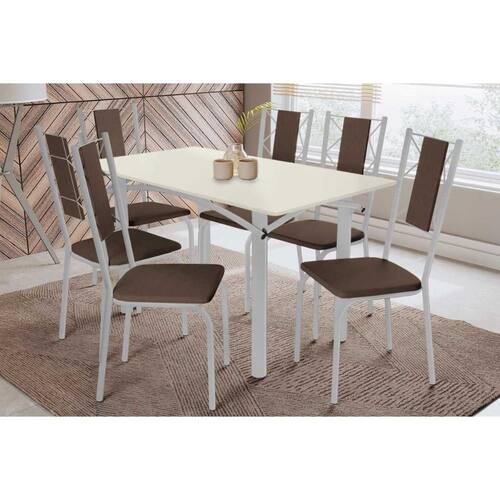 Sala de Jantar Completa Elba Tampo Madeirado c/ Vidro 160cm e 6 Cadeiras Lisboa Cromada/Off White - Courano Marrom - Kappesberg Abaixo segue os produtos do KIT: Sala de Jantar Completa Elba Tampo Madeirado c/ Vidro 160cm e 6 Cadeiras Lisboa Cromada/Off White - Courano Marrom - Kappesberg