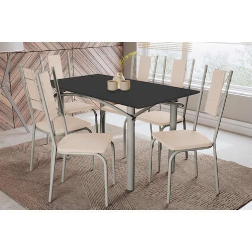 Sala de Jantar Completa Elba Tampo Madeirado c/ Vidro 160cm e 6 Cadeiras Lisboa Niquel/Preto - Courano Bege - Kappesberg Abaixo segue os produtos do KIT: Sala de Jantar Completa Elba Tampo Madeirado c/ Vidro 160cm e 6 Cadeiras Lisboa Niquel/Preto - Courano Bege - Kappesberg