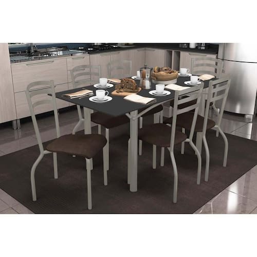 Sala de Jantar Completa Elba Tampo Madeirado c/ Vidro 160cm e 6 Cadeiras Portugal Niquel/Preto - Courano Marrom - Kappesberg Abaixo segue os produtos do KIT: Sala de Jantar Completa Elba Tampo Madeirado c/ Vidro 160cm e 6 Cadeiras Portugal Niquel/Preto - Courano Marrom - Kappesberg