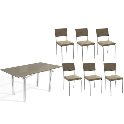 Abaixo segue os produtos do KIT: Sala de Jantar Completa Elba Tampo Madeirado c/ Vidro 160cm e 6 Cadeiras Zaria Cromada/Freijo Bronze - Suede Bege - Kappesberg
