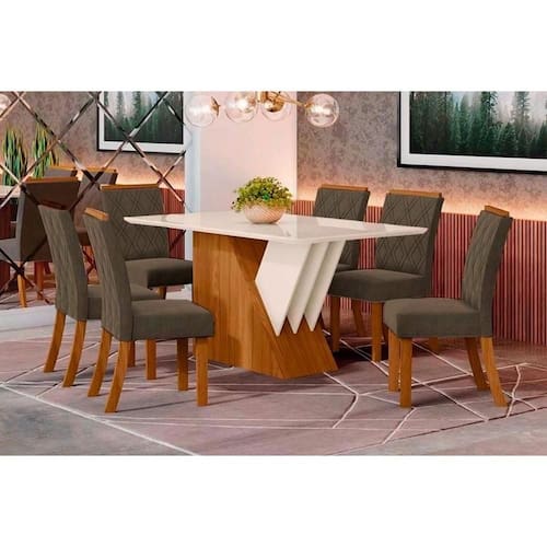 Sala de Jantar Completa Épic SC24 Tampo Madeirado c/ Vidro Canto Curvo 160x90cm e 6 Cadeiras Vita Nature/Suede Light Bege - Henn
