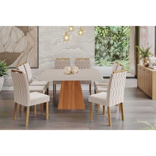 Sala Jantar Mesa Helena Tampo Madeirado c/ Vidro 210x100cm e 8 Cadeiras Paola Cinamomo/Off White - Carvalho/Suede Nude Bege - Cimol