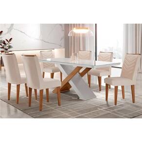 Sala de Jantar Completa Imperatriz Tampo Madeirado c/ Vidro Canto Curvo 180x90 e 6 Cadeiras Londrina Imbuia/Off White - Suede Creme - Rufato