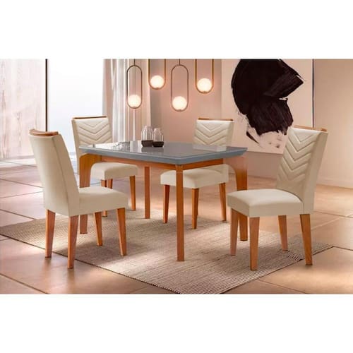 Sala de Jantar Completa Londrina Tampo Madeirado c/ Vidro 120cm + 4 Cadeiras Londrina Imbuia/Veludo Creme - Rufato