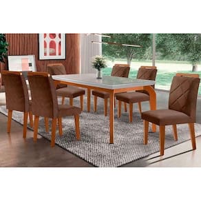Sala Jantar Mesa Londrina Tampo Madeirado c/ Vidro Curvo 120x80 e 4 Cadeiras Melissa Imbuia/Suede Capuccino - Rufato