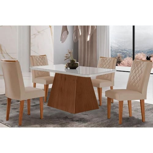 Sala de Jantar Completa Luna c/ Tampo Madeirado c/ Vidro Canto Curvo 120x80cm e 4 cadeiras Jade Imbuia/Off White - Suede Creme - Rufato