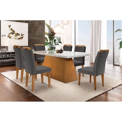 Conjunto: Mesa Sala Jantar Luna C/ Tampo Madeirado C/ Vidro Canto Reto 180cm + 6 Cadeiras Athenas Imbuia/grafite - Rufato