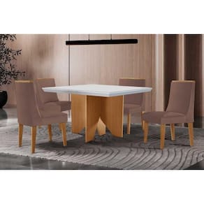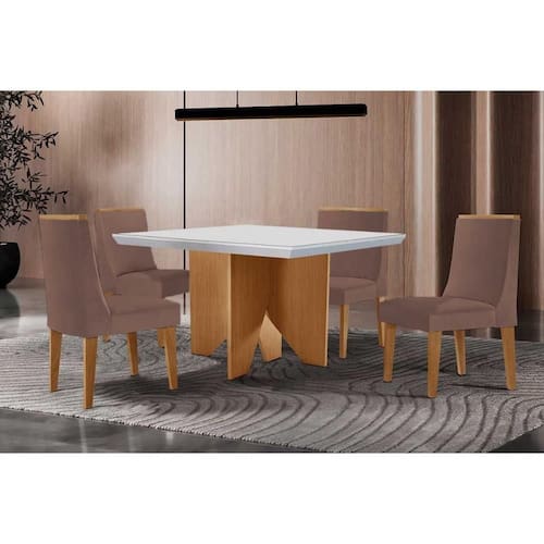 Conjunto: Mesa Sala Jantar Nevada Curvo 90cm + 4 Cadeiras Dakota Madeira Naturale/Off White - Capuccino/Linho Capuccino - Rufato - Blush