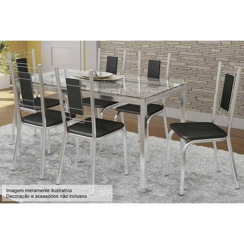Sala de Jantar Completa Reno c/ Tampo Vidro 150cm + 6 Cadeiras Florença Cromado/Courano Preto - Kappesberg
