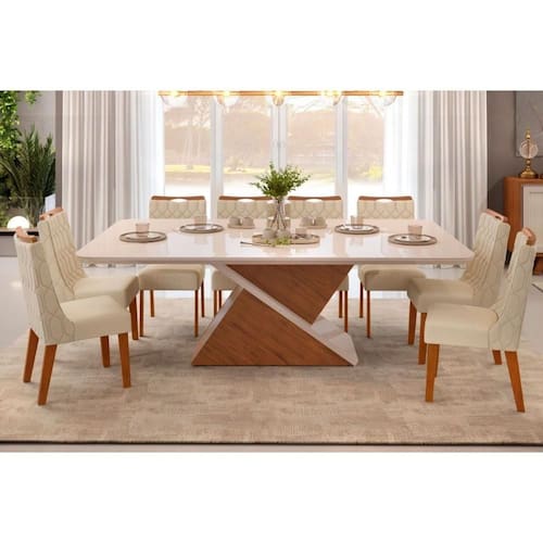 Sala de Jantar Completa Zafira Tampo Madeirado c/ Vidro Curvo 200x100cm e 8 Cadeiras Bia Freijo/Off White - Linho Neve - DJ Móveis Abaixo segue os produtos do KIT: Sala de Jantar Completa Zafira Tampo Madeirado c/ Vidro Curvo 200x100cm e 8 Cadeiras Bia Freijo/Off White - Linho Neve - DJ Móveis