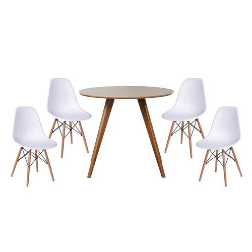 O Conjunto contém: • 1 Mesa Square Redonda Tampo Bétula 88cm • 4 Cadeiras Eiffel Branca com Base Madeira