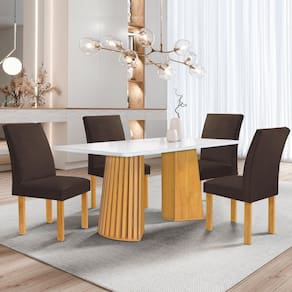 Renove sua sala de jantar com o conjunto Mesa Stella, acompanhado por quatro cadeiras. A mesa tem um visual moderno, com linhas suaves e elegantes. As cadeiras são confortáveis e têm um estilo sofisticado. Juntos, eles fazem da sua sala de jantar um lugar especial para reunir a família e os amigos.