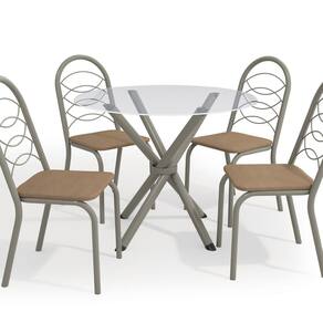 Para ambientes modernos, o conjunto CMC683 da Kappesberg é a melhor opção. Em estrutura metálica pintada com tinta epóxi na cor níquel, a mesa possui um design único, com destaque para a disposição dos pés, unidos por um anel central. Medindo 75cm de altura e 73cm de largura e profundidade, combinada ao tampo de vidro redondo e transparente TAV9561, com 6mm de espessura, ela acomoda até quatro pessoas. Já as cadeiras, no modelo Holanda, também em estrutura metálica pintada na cor níquel, medindo 91,8cm de altura, sendo 46cm a altura do assento, suportam até 130kg, garantindo estabilidade e resistência. E para mais comodidade, o assento é estofado e recoberto em sintético na cor capuccino. Já o encosto, enclinado, conta com detalhes em aramado, que proporcionam um melhor acabamento e conforto.