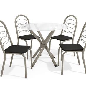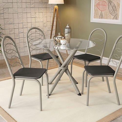 Para ambientes modernos, o conjunto CMC683 da Kappesberg é a melhor opção. Em estrutura metálica pintada com tinta epóxi na cor níquel, a mesa possui um design único, com destaque para a disposição dos pés, unidos por um anel central. Medindo 75cm de altura e 73cm de largura e profundidade, combinada ao tampo de vidro redondo e transparente TAV9561, com 6mm de espessura, ela acomoda até quatro pessoas. Já as cadeiras, no modelo Holanda, também em estrutura metálica pintada na cor níquel, medindo 91,8cm de altura, sendo 46cm a altura do assento, suportam até 130kg, garantindo estabilidade e resistência. E para mais comodidade, o assento é estofado e recoberto em sintético na cor preta. Já o encosto, enclinado, conta com detalhes em aramado, que proporcionam um melhor acabamento e conforto.