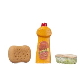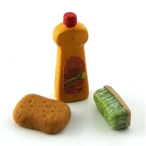 Este conjunto de limpeza de cozinha será uma boa adição à sua cena em miniatura. A tampa do frasco de limpeza não é removível e o frasco não contém nenhum produto. A escova é de resina e não tem cerdas. A esponja não é real. Dimensões: Garrafa - 13/16" A x 5/16" L x ¼” D. Escova de esfregar - 7/16" L x ¼” A x ¼” W. Esponja - ½ “L x 3/8" L x 1/85" H. 1 polegada a 1 pé. Escala 1:12. É do tamanho de uma casa de bonecas. Modelo em escala detalhado para colecionadores adultos. Não se destina a crianças menores de 14 anos.