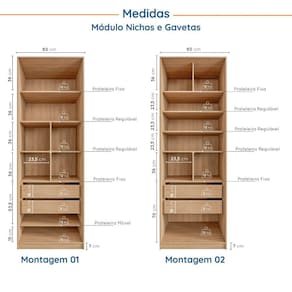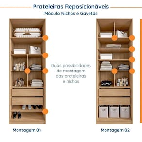 O guarda roupas Joy CabeCasa foi desenvolvido para trazer a experiência de ter seu guarda roupas planejado por uma personal organizer. O móvel possui prateleiras reguláveis e removíveis que se adaptam a diversas necessidades. Conta também com um kit que pode conter gabaritos de dobra para roupas, separadores de cabides e adesivos para identificar todos os espaços. Possui um módulo de sapateira ideal para quem precisa de espaço para guardar seus calçados e ainda pendurar acessórios, além de um nicho que confere mais versatilidade e organização ao espaço, possui montagem flex, podendo ser montado tanto para direita quanto para esquerda. Além disso, tem design atual e alinhado às suas tendências que irão trazer muito mais sofisticação e aconchego para a decoração. Acabamento da Prateleira: Finish Foil Escala de Brilho da Prateleira: Semi-Fosco Possui Cabideiros: Não Acabamento da Gaveta: Finish Foil Escala de Brilho da Gaveta: Semi-Fosco Possui Organizador de Gaveta: Não Acabamento da Porta: Finish Foil Escala de Brilho da Porta: Semi-Brilho Acabamento dos Pés: Finish Foil Altura dos Pés: 7 cm Ambiente Principal: Quarto Complexidade da Montagem: Alta: deve ser montado por um montador especializado Cor: Salmão/Avena Cor do Produto: Salmão/Avena Cor Flex: Não Cor Interna: Avena Escala de Brilho: Super-Brilho Gaveta com Chave: Não Guarda-Roupa Suporta Até (kg): 12 kg Itens Inclusos: 2 Modulados, kit organizer e manual de montagem Linha ou Coleção: Joy Manual de Montagem e Instalação: https://cdn2.madeiramadeira.com.br/atributo/tom-da-cor/1175313-622-e-623-2-merged.pdf Material da Gaveta: MDP Material da Porta: MDP Material da Prateleira: MDP Material dos Pés: MDP Material Principal: MDP Necessita Montagem: Sim Origem do Produto: Nacional Peso: 145 kg Peso Máximo por Gaveta: 8 kg Peso Máximo por Prateleira: 12 kg Possui Calceiros: Não Possui Espelho: Não Possui Pés: Rodapé Possui Portas: 04 Possui Prateleiras: 09 Recomendações de Uso, Manutenção e Limpeza: Retire o pó com flanela seca. Sapatas Niveladoras: Não Sistema de Montagem: Retire o pó com flanela seca. Tipo de Corrediça da Gaveta: Metálica Telescópica Tipo de Dobradiça/Corrediça da Porta: Metálica Tipo de Gaveta: Externa Tipo de Guarda-Roupa: Modulado Casal Tipo de Puxador da Gaveta: Não Possui Tipo de Puxador da Porta: Externo