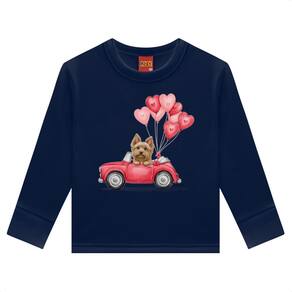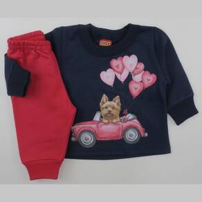Blusa azul marinho com estampa de cachorrinho e calça vermelha.