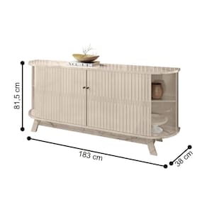 O Buffet é feito em MDP 15/25mm. Possui 4 portas basculantes e deslizantes em MDF, 2 gavetas com corrediças telescópicas, 3 prateleiras e contém detalhes curvos no tampo e na base.