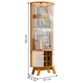 A Cristaleira é feita em MDP 12/15mm. Contém 4 portas de vidro e deslizantes, luminárias em LED e espelhos, 2 prateleiras de vidro 6mm.