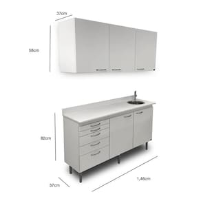 Dimensões do conjunto Armario Superior (suspenso) - Altura 58cm, Profundidade: 37cm, Largura: 1.46cm Bancada - Altura: 82cm, Profundidade 37cm, Largura 1.46cm