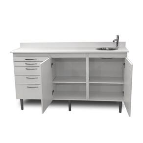 Características: Pia em aço INOX 25cm de diâmetro internamente, não acumula sujeira e possui alta resistência a corrosão Puxadores em metal cromado 128mm extremamente resistentes Gavetas com corrediça telescópica, que garantem abertura total da gaveta, maior tempo de vida útil e maior resistência ao peso Fácil limpeza e desinfecção da superfície do móvel As prateleiras do modulo inferior são ajustáveis Fabricado 100% em MDF Branco TX (Textura levemente granulada de brilho discreto)