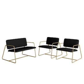 Detalhes Técnicos - Assento e Encosto Tapeçados, Estofados e Fixos - Espuma do Assento e do Encosto: D20 - Tonalidade: Dourado/Suede Preto - Material: Metalon - Medida Poltrona Namoradeira: A:75CM x L:104CM x P:85CM - Medida do chão até o assento: 45cm de altura - Poltrona e Namoradeira suporta até 120KG (cada) - Montagem: Difícil - Medida Poltronas: A:75CM x L:68CM x P:85CM - Medida do chão até o assento: 45cm de altura - Montagem: Difícil
