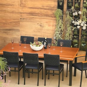 O Conjunto de Jantar Náutico para área gourmet externa combina design sofisticado e praticidade, ideal para reunir família e amigos em momentos memoráveis. A mesa retangular com tampo em madeira clara contrasta harmoniosamente com a estrutura metálica preta, oferecendo resistência e durabilidade mesmo em ambientes externos.