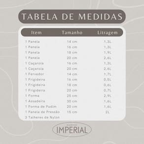 Composição do conjunto: a numeração é referente ao tamanho da boca das panelas, confira as medidas em litros nas fotos do anuncio 1 panela 14cm 1 panela 16cm 1 panela 18cm 1 panela 20cm 1 caçarola 16cm 1 caçarola 20cm 1 fervedor 14cm 1 frigideira 14cm 1 frigideira 16cm 1 frigideira 18cm 1 forma redonda 22cm 1 forma de pudim e bolo 20cm 1 forma retangular 1 panela 2 litros 3 talheres de nylon As formas podem variar de acordo com o Leve a sua cozinha a um novo nível de excelência culinária com o conjunto de panelas imperial teflon antiaderente com tampa de vidro. Composto por um conjunto abrangente de panelas de alta qualidade, este conjunto irá elevar as suas habilidades culinárias e facilitar a sua rotina na cozinha. Cada peça deste conjunto foi cuidadosamente projetada para fornecer resultados excepcionais e durabilidade em longo prazo. O revestimento antiaderente em teflon garante que os alimentos não grudem, permitindo que você cozinhe com facilidade e evite a necessidade de usar grandes quantidades de óleo ou gordura. Além disso, nossas panelas possuem tampa de vidro, permitindo que você acompanhe o processo de cozimento sem perder o calor ou o vapor essencial para a preparação dos alimentos. São tampas de vidro temperadas, inquebráveis, visando sua segurança e de sua família. A qualidade e a segurança são garantidas com o selo de qualidade inmetro, assegurando que este conjunto de panelas atenda aos mais altos padrões de fabricação e segurança. O conjunto inclui uma variedade de tamanhos de panelas e frigideiras, desde panelas menores de 16 cm até formas maiores de 30 cm. Com essa diversidade, você terá o utensílio certo para cada tipo de preparação culinária. Não apenas adequado para o seu uso pessoal, este conjunto de panelas também é perfeito para presentear alguém especial. Seja para um cozinheiro iniciante ou um chef experiente, este conjunto de panelas é um presente prático e sofisticado que certamente será apreciado. Traga eficiência e estilo para a sua cozinha com o conjunto de panelas teflon antiaderente com tampa de vidro. Prepare refeições incríveis, economize tempo e desfrute de uma cozinha mais prática e moderna. Invista na qualidade e nos desempenhos excepcionais deste conjunto de panelas, e ele se tornará um item essencial para a sua rotina culinária. No momento de realizar os seus preparativos favoritos, é essencial que você tenha uma panela que possa ser sua aliada na cozinha. Com a panela alegrete você pode ter certeza de que os sabores e aromas serão perfeitamente preservados para desfrutar de refeições mais gostosas. Solte o chef interior que existe dentro de você Materiais de qualidade O principal benefício do alumínio é que, por ser um excelente condutor de calor, os alimentos cozinham muito mais rápido que em comparação com outros metais. Por sua vez, os produtos de alumínio são bastante leves, o que os faz confortáveis para serem levados de um lugar a outro na cozinha. Marca: Não Informado