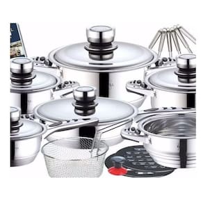 Este Conjunto de Panelas em aço Cirúrgico contém 19 peças, sendo elas: