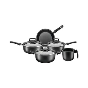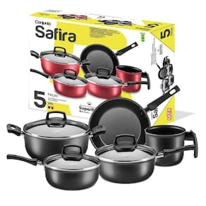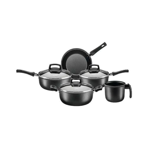 Contém: - 01 Caçarola com tampa de vidro n°20 - 01 Panela com tampa de vidro n°18 - 01 Panela com tampa de vidro n°16 - 01 Frigideira francesa n°20 - 01 Fervedor sem tampa n°12