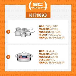 Componentes do kit: - 01 jogo de panelas com fundo triplo corpo e tampas em inox 5 pçs - allegra - tramontina cód. 65650280 - 01 panela aço inox com fundo triplo solar pit 1 cód. 65510830 solar Descrição e característica da ficha técnica: Jogo de panelas com fundo triplo corpo e tampas em inox 5 pçs - allegra - tramontina cód. 65650280 1 un - panela 1,5 litro allegra 13,9cm a x 18cm l x 33,3cm p Diâmetro: 16cm ref. 62651160 1 un - panela 2,20 litros allegra 10cm a x 18cm l x 38cm p Diâmetro: 18cm ref. 62651181 1 un - caçarola funda 3,10 litros allegra 16,5cm a x 22,2cm l x 27,5cm p Diâmetro: 20cm ref. 62654200 1 un - cozi-vapore 1,7 litros allegra 9,2cm a x 18,1cm l x 23,3cm p Diâmetro: 16cm ref. 62660161 1 un - frigideira s/ tampa 1,3 litros allegra 6,8cm a x 22,4cm l x 39,9cm p Diâmetro: 20cm ref. 62666200 - peso líquido do conjunto: 3,34 kg - peso bruto do conjunto: 3,98 kg - medidas da embalagem: 11cm a x 44,7cm l x 58,5cm p Panela aço inox com fundo triplo solar pit 1 cód. 65510830 solar - o fundo triplo aço inox + alumínio + aço inox . - podem ir ao forno para gratinar ou finalizar pratos, na temperatura máxima de 260c. - podem ser utilizadas nos fogões: gás, elétrico, vitrocerâmico e indução. - : 25 anos 90 dias de legal, acrescidos de 24 anos e 09 meses de contratual para vícios ou defeitos de fabricação - pit 1 - 62503240 diâmetro - 24cm 4,7l espessura: 0,7mm ean: 7891116000960 - peso bruto: 2,09 kg - medida embalagem: 13 cm alt x 35 cm l x 38 cm p.