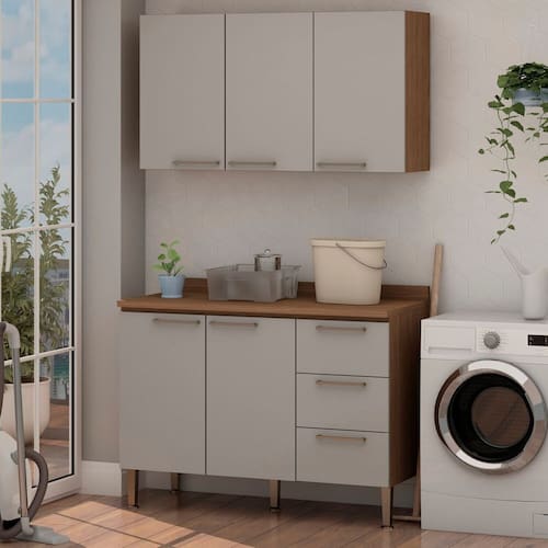 Kit Lavanderia com 2 Módulos Para Lavanderia com Gavetas Low Dry possui ferragens de qualidade, além de dobradiças metálicas.