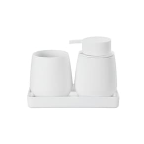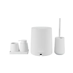 - Tudo em um só conjunto: inclui lixeira, escova sanitária, porta-escovas, dispenser e bandeja