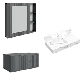 O CONJUNTO é composto por ARMÁRIO + ESPELHEIRA + BANCADA. ARMÁRIO fabricado em MDP BP (15mm), com ripas autênticas de HDF BP (06mm), na largura de 20mm. Puxadores em alumínio anodizado, gaveta com corrediças telescópicas, e porta com dobradiças slow, com sistema amortecedor. ESPELHEIRA possuí espelho de 550 X 390 X 03 mm com acabamento lapidado, estruturado em porta com ripas autênticas de HDF BP (06mm). Possui prateleiras internas, porta com dobradiças slow, com sistema de amortecedor e nicho com prateleiras ao lado, para maior organização. BANCADA com cuba esculpida, fábricada em porcelanato, com baixíssima absorção de umidade, resistente a riscos e manchas. Armário e Espelheira acompanham tapa furos + parafusos + buchas de nylon para fixação na parede. B Altura do Conjunto: 70 cm Ambiente: null Ambiente Principal: Banheiro Cor: Cinza Informação Complementar: 1x Bancada em Porcelanato para Banheiro 80cm Pró com Cuba Esculpida Lavatórios Calacata Largura: 80 Altura: 22.2 Peso: 17.935 Profundidade: 40 Necessita Montagem: Não