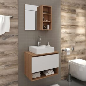Quando falamos de banheiro pensamos em bem-estar. Pois o banheiro é onde a gente recarrega nossa energia vital, idealiza sonhos, e realiza toda a manutenção necessária para uma saúde física e mental. Com design prático, o móvel entrega ao ambiente toques de modernidade e elegância. Funcional, acondiciona produtos de higiene e beleza, porta escova, papel higiênico, toalhas, artigos de limpeza, entre tantos outros objetos pessoais. Estrutura em MDP e acabamento em BP. Não acompanha cuba. Imagem meramente ilustrativa. A decoração do ambiente não acompanha o produto. O produto será entregue desmontado. Altura do Conjunto: 54 cm Ambiente: null Ambiente Principal: Banheiro Cor: Amêndoa/Branco Informação Complementar: 1x Gabinete Suspenso para Banheiro 60cm 1 Porta Basculante 1 Nicho BN3606 Amêndoa/BrancoLargura: 60Altura: 46.5Peso: 12Profundidade: 38.7Necessita Montagem: Sim1x Espelheira para Banheiro 3 Nichos BN3609 AmendoaLargura: 60Altura: 54Peso: 7.65Profundidade: 15.6Necessita Montagem: Sim Material Principal: MDP Possui Rodízio: Tamanho: