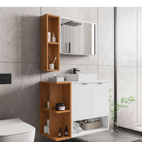 O Conjunto Para Banheiro Ibiza contém design inovador e funcional, com nichos laterais que irão acomodar perfeitamente utensílios essenciais para o seu banheiro. Composto por cuba de mármore sintético em formato retangular, o gabinete contém amplo nicho e 2 portas. A espelheira e o gabinete possuem nichos que podem ser instalados tanto à direita quanto à esquerda do móvel.