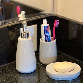 • Dimensões: Porta Sabonete Líquido Ø 8,5x20,5cm | Porta Escovas Ø 7,5x10,7cm | Saboneteira 13,5x10x3cm