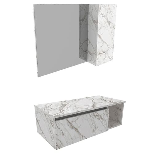 Conjunto Para Banheiro. Com design prático e funcional, estas peças ao ambiente toques de modernidade e elegância. Possuem estruta em MDP de 15mm, e acabamento em pintura UV/BP. Composto por espelheira com 01 porta na lateral do espelho com dobradiças metálicas e 3 nichos internos, espelho ja fixado no painel, gabinete com 01 porta basculante com dobradiças metálicas e articulador com trava, 01 nicho, 02 gavetas com corrediças metálicas, ideal para cuba de apoio (cuba não inclusa). Este conjunto é uma ótima escolha para manter seus produtos de higiene e beleza sempre organizados. Estes produtos chegarão na sua casa separados em 02 volumes.