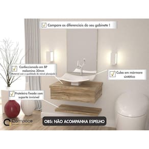 A bancada Metrópole 605W é um produto compacto de design moderno e minimalista, projetado para pequenos espaços, perfeita para fazer parte do seu banheiro ou lavabo. Produzido todo em MDP-BP 15mm amadeirado, conta com uma cuba de apoio e 1 prateleira com pinos invisíveis, além do suporte toalheiro em alumínio. Acabamento da Cuba: Gel Acabamento da Prateleira: BP Acetinado Acompanha Cuba: Sim Acompanha Tampo: Sim codigo_ean: 7893640048043 Complexidade da Montagem: Média: pode ser montado por mais de uma pessoa e/ou necessite de maior conhecimento para montagem Cor: Carvalho Cor da Cuba: Branco Cor do Produto: Carvalho Cor Interna: Carvalho Escala de Brilho: Fosco Escala de Brilho da Prateleira: Fosco Furação para Cuba e Torneira: Não Informações Complementares: Prateleira suporta 02 kg Itens Inclusos: 1 Gabinete com Cuba e Prateleira Itens Inclusos: 1 Gabinete com Cuba e Prateleira Linha ou Coleção: Metrópole Manual de Montagem e Instalação: https://product-hub-prd.madeiramadeira.com.br/508402/documents/eb43ecc2-d4ec-4055-9fbc-99b2a611e359emontagembancada60080001pg.pdf Material da Cuba: Mármore Sintético Material da Prateleira: MDF/MDP Material do Tampo: MDF/MDP Material Principal: MDF/MDP Medida da Cuba (C x L x P): 43,5cm x 36cm x 12cm Medida do Gabinete (A x L x P): 19cm x 60cm x 43cm Montagem Flex: Sim, o suporte toalheiro pode ser montado em qualquer um dos lados. Necessita Montagem: Sim Origem do Produto: Nacional Peso: 15,35 kg Peso Máximo por Prateleira: 2 kg Possui Espelheira: Não Possui Gabinete: Sim Possui Gavetas: Não Possui iluminação: Não Possui Pés: Suspenso Possui Portas: Não Possui Rodízio: Não Produto Montado: Sim Recomendações de Uso, Manutenção e Limpeza: Para a limpeza, utilize flanela seca ou pano macio levemente umedecido em água. Utilize um pano seco em seguida. Evite contato com produtos químicos (solventes, thinner, acetona, etc) e não utilize nenhum tipo de esponja de aço. Sistema de Montagem: Parafusos e buchas Suporta Até (kg): 10 kg