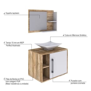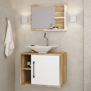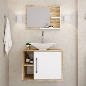 O Conjunto Balcão com Cuba e Espelheira Laura 600 KTLR600 tem design compacto, perfeito para pequenos espaços, conta com uma prateleira lateral e uma cuba de apoio, além da espelheira. Possui fitas de borda em PVC com colagem PUR, garantindo maior durabilidade ao seu móvel. Acabamento da Cuba: Gel Acabamento da Porta: BP Acetinado Acabamento da Prateleira: BP Acetinado Acompanha Cuba: Sim Acompanha Tampo: Sim codigo_ean: 7908439697637 Complexidade da Montagem: Média: pode ser montado por mais de uma pessoa e/ou necessite de maior conhecimento para montagem Cor: Carvalho/Branco Chess Cor da Cuba: Branco Cor do Produto: Carvalho/Branco Chess Cor Interna: Marrom Escala de Brilho: Fosco Escala de Brilho da Porta: Fosco Escala de Brilho da Prateleira: Fosco Espessura do Espelho: 3 mm Formato do Espelho: Retangular Furação para Cuba e Torneira: Não Itens Inclusos: 1 Gabinete com Cuba, 1 Espelheira, kit de ferragens e manual de montagem Linha ou Coleção: Laura 600 Manual de Montagem e Instalação: https://product-hub-prd.madeiramadeira.com.br/672199/documents/daeb7941-f4d3-4b12-917e-e1f78fa0e0e27991manualgabinetelaura600.pdf Material da Cuba: Mármore Sintético Material da Porta: MDP Material da Prateleira: MDP Material do Puxador da Porta: ABS Material do Tampo: MDP Material Principal: MDP Medida da Cuba (C x L x P): 38,5cm x 33cm x 11,5cm Medida da Espelheira (A x L x P): 42cm x 60cm x 11,5cm Medida do Gabinete (A x L x P): 45cm x 60cm x 40cm Necessita Montagem: Sim Origem do Produto: Nacional Peso: 20,37 kg Peso Máximo por Prateleira: 1 kg Possui Espelheira: Sim Possui Gabinete: Sim Possui Gavetas: Não Possui iluminação: Não Possui Pés: Suspenso Possui Portas: Sim Possui Rodízio: Não Produto Montado: Sim Recomendações de Uso, Manutenção e Limpeza: Para a limpeza, utilize flanela seca ou pano macio levemente umedecido em água. Utilize um pano seco em seguida. Evite contato com produtos químicos (solventes, thinner, acetona, etc) e não utilize nenhum tipo de esponja de aço. Sistema de Montagem: Parafusos e buchas Tamanho do Espelho (A x L): 40cm x 35cm Tipo de Dobradiça/Corrediça da Porta: Metálica Tipo de Porta: Bater Tipo de Puxador da Porta: Externo