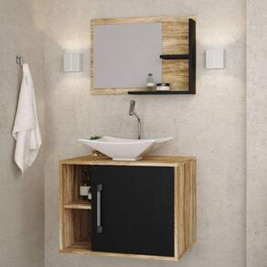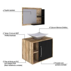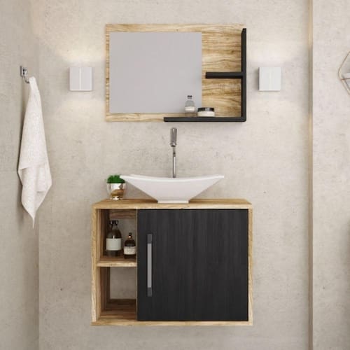 O Conjunto Balcão com Cuba e Espelheira Laura 600 KTLR600 tem design compacto, perfeito para pequenos espaços, conta com uma prateleira lateral e uma cuba de apoio, além da espelheira. Possui fitas de borda em PVC com colagem PUR, garantindo maior durabilidade ao seu móvel. Acabamento da Cuba: Gel Acabamento da Porta: BP Acetinado Acabamento da Prateleira: BP Acetinado Acompanha Cuba: Sim Acompanha Tampo: Sim codigo_ean: 7908439697644 Complexidade da Montagem: Média: pode ser montado por mais de uma pessoa e/ou necessite de maior conhecimento para montagem Cor: Carvalho/Preto Ônix Cor da Cuba: Branco Cor do Produto: Carvalho/Preto Ônix Cor Interna: Marrom Escala de Brilho: Fosco Escala de Brilho da Porta: Fosco Escala de Brilho da Prateleira: Fosco Espessura do Espelho: 3 mm Formato do Espelho: Retangular Furação para Cuba e Torneira: Não Itens Inclusos: 1 Gabinete com Cuba, 1 Espelheira, kit de ferragens e manual de montagem Linha ou Coleção: Laura 600 Manual de Montagem e Instalação: https://product-hub-prd.madeiramadeira.com.br/672200/documents/bb33ef0f-973c-4c89-ac64-cb2c7ba5db5d7998manualgabinetelaura600.pdf Material da Cuba: Mármore Sintético Material da Porta: MDP Material da Prateleira: MDP Material do Puxador da Porta: ABS Material do Tampo: MDP Material Principal: MDP Medida da Cuba (C x L x P): 38,5cm x 33cm x 11,5cm Medida da Espelheira (A x L x P): 42cm x 60cm x 11,5cm Medida do Gabinete (A x L x P): 45cm x 60cm x 40cm Necessita Montagem: Sim Origem do Produto: Nacional Peso: 20,37 kg Peso Máximo por Prateleira: 1 kg Possui Espelheira: Sim Possui Gabinete: Sim Possui Gavetas: Não Possui iluminação: Não Possui Pés: Suspenso Possui Portas: Sim Possui Rodízio: Não Produto Montado: Sim Recomendações de Uso, Manutenção e Limpeza: Para a limpeza, utilize flanela seca ou pano macio levemente umedecido em água. Utilize um pano seco em seguida. Evite contato com produtos químicos (solventes, thinner, acetona, etc) e não utilize nenhum tipo de esponja de aço. Sistema de Montagem: Parafusos e buchas Tamanho do Espelho (A x L): 40cm x 35cm Tipo de Dobradiça/Corrediça da Porta: Metálica Tipo de Porta: Bater Tipo de Puxador da Porta: Externo