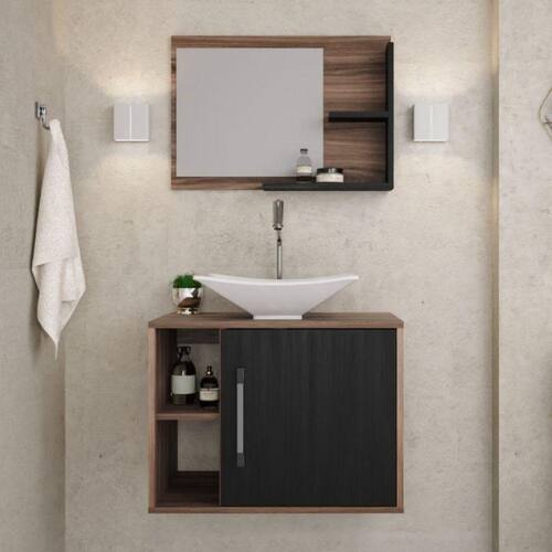 O Conjunto Balcão com Cuba e Espelheira Laura 600 KTLR600 tem design compacto, perfeito para pequenos espaços, conta com uma prateleira lateral e uma cuba de apoio, além da espelheira. Possui fitas de borda em PVC com colagem PUR, garantindo maior durabilidade ao seu móvel. Acabamento da Cuba: Gel Acabamento da Porta: BP Acetinado Acabamento da Prateleira: BP Acetinado Acompanha Cuba: Sim Acompanha Tampo: Sim codigo_ean: 7908439697583 Complexidade da Montagem: Média: pode ser montado por mais de uma pessoa e/ou necessite de maior conhecimento para montagem Cor: Nogal/Preto Ônix Cor da Cuba: Branco Cor do Produto: Nogal/Preto Ônix Cor Interna: Marrom Escala de Brilho: Fosco Escala de Brilho da Porta: Fosco Escala de Brilho da Prateleira: Fosco Espessura do Espelho: 3 mm Formato do Espelho: Retangular Furação para Cuba e Torneira: Não Itens Inclusos: 1 Gabinete com Cuba, 1 Espelheira, kit de ferragens e manual de montagem Linha ou Coleção: Laura 600 Manual de Montagem e Instalação: https://product-hub-prd.madeiramadeira.com.br/672194/documents/facfe1ef-ffa7-4082-8b0b-43b2042ab6d98019manualgabinetelaura600.pdf Material da Cuba: Mármore Sintético Material da Porta: MDP Material da Prateleira: MDP Material do Puxador da Porta: ABS Material do Tampo: MDP Material Principal: MDP Medida da Cuba (C x L x P): 38,5cm x 33cm x 11,5cm Medida da Espelheira (A x L x P): 42cm x 60cm x 11,5cm Medida do Gabinete (A x L x P): 45cm x 60cm x 40cm Necessita Montagem: Sim Origem do Produto: Nacional Peso: 20,37 kg Peso Máximo por Prateleira: 1 kg Possui Espelheira: Sim Possui Gabinete: Sim Possui Gavetas: Não Possui iluminação: Não Possui Pés: Suspenso Possui Portas: Sim Possui Rodízio: Não Produto Montado: Sim Recomendações de Uso, Manutenção e Limpeza: Para a limpeza, utilize flanela seca ou pano macio levemente umedecido em água. Utilize um pano seco em seguida. Evite contato com produtos químicos (solventes, thinner, acetona, etc) e não utilize nenhum tipo de esponja de aço. Sistema de Montagem: Parafusos e buchas Tamanho do Espelho (A x L): 40cm x 35cm Tipo de Dobradiça/Corrediça da Porta: Metálica Tipo de Porta: Bater Tipo de Puxador da Porta: Externo