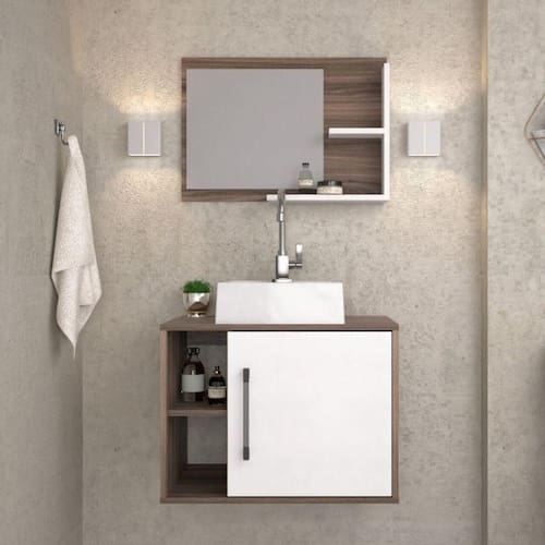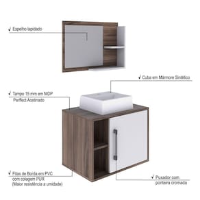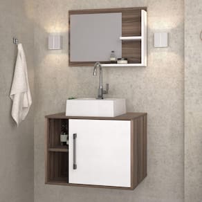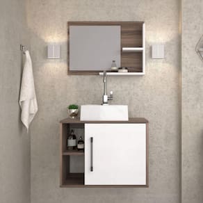 O Conjunto Balcão com Cuba e Espelheira Laura 600 KTLR600 tem design compacto, perfeito para pequenos espaços, conta com uma prateleira lateral e uma cuba de apoio, além da espelheira. Possui fitas de borda em PVC com colagem PUR, garantindo maior durabilidade ao seu móvel. Acabamento da Cuba: Gel Acabamento da Porta: BP Acetinado Acabamento da Prateleira: BP Acetinado Acompanha Cuba: Sim Acompanha Tampo: Sim codigo_ean: 7908439697811 Complexidade da Montagem: Média: pode ser montado por mais de uma pessoa e/ou necessite de maior conhecimento para montagem Cor: Nogal/Branco Chess Cor da Cuba: Branco Cor do Produto: Nogal/Branco Chess Cor Interna: Marrom Escala de Brilho: Fosco Escala de Brilho da Porta: Fosco Escala de Brilho da Prateleira: Fosco Espessura do Espelho: 3 mm Formato do Espelho: Retangular Furação para Cuba e Torneira: Não Itens Inclusos: 1 Gabinete com Cuba, 1 Espelheira, kit de ferragens e manual de montagem Linha ou Coleção: Laura 600 Manual de Montagem e Instalação: https://product-hub-prd.madeiramadeira.com.br/672000/documents/c9e490e8-5dac-4a31-960a-8b48b6a1e9fd7358manualgabinetelaura600.pdf Material da Cuba: Mármore Sintético Material da Porta: MDP Material da Prateleira: MDP Material do Puxador da Porta: ABS Material do Tampo: MDP Material Principal: MDP Medida da Cuba (C x L x P): 33cm x 30cm x 10cm Medida da Espelheira (A x L x P): 42cm x 60cm x 11,5cm Medida do Gabinete (A x L x P): 45cm x 60cm x 40cm Necessita Montagem: Sim Origem do Produto: Nacional Peso: 20,37 kg Peso Máximo por Prateleira: 1 kg Possui Espelheira: Sim Possui Gabinete: Sim Possui Gavetas: Não Possui iluminação: Não Possui Pés: Suspenso Possui Portas: Sim Possui Rodízio: Não Produto Montado: Sim Recomendações de Uso, Manutenção e Limpeza: Para a limpeza, utilize flanela seca ou pano macio levemente umedecido em água. Utilize um pano seco em seguida. Evite contato com produtos químicos (solventes, thinner, acetona, etc) e não utilize nenhum tipo de esponja de aço. Sistema de Montagem: Parafusos e buchas Tamanho do Espelho (A x L): 40cm x 35cm Tipo de Dobradiça/Corrediça da Porta: Metálica Tipo de Porta: Bater Tipo de Puxador da Porta: Externo