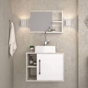 O Conjunto Balcão com Cuba e Espelheira Laura 600 KTLR600 tem design compacto, perfeito para pequenos espaços, conta com uma prateleira lateral e uma cuba de apoio, além da espelheira. Possui fitas de borda em PVC com colagem PUR, garantindo maior durabilidade ao seu móvel. Acabamento da Cuba: Gel Acabamento da Porta: BP Acetinado Acabamento da Prateleira: BP Acetinado Acompanha Cuba: Sim Acompanha Tampo: Sim codigo_ean: 7908439697842 Complexidade da Montagem: Média: pode ser montado por mais de uma pessoa e/ou necessite de maior conhecimento para montagem Cor: Snow/Branco Chess Cor da Cuba: Branco Cor do Produto: Snow/Branco Chess Cor Interna: Branco Escala de Brilho: Fosco Escala de Brilho da Porta: Fosco Escala de Brilho da Prateleira: Fosco Espessura do Espelho: 3 mm Formato do Espelho: Retangular Furação para Cuba e Torneira: Não Itens Inclusos: 1 Gabinete com Cuba, 1 Espelheira, kit de ferragens e manual de montagem Linha ou Coleção: Laura 600 Manual de Montagem e Instalação: https://product-hub-prd.madeiramadeira.com.br/672003/documents/781352dc-30b9-4647-b5b0-7ab2e00625137300manualgabinetelaura600.pdf Material da Cuba: Mármore Sintético Material da Porta: MDP Material da Prateleira: MDP Material do Puxador da Porta: ABS Material do Tampo: MDP Material Principal: MDP Medida da Cuba (C x L x P): 33cm x 30cm x 10cm Medida da Espelheira (A x L x P): 42cm x 60cm x 11,5cm Medida do Gabinete (A x L x P): 45cm x 60cm x 40cm Necessita Montagem: Sim Origem do Produto: Nacional Peso: 20,37 kg Peso Máximo por Prateleira: 1 kg Possui Espelheira: Sim Possui Gabinete: Sim Possui Gavetas: Não Possui iluminação: Não Possui Pés: Suspenso Possui Portas: Sim Possui Rodízio: Não Produto Montado: Sim Recomendações de Uso, Manutenção e Limpeza: Para a limpeza, utilize flanela seca ou pano macio levemente umedecido em água. Utilize um pano seco em seguida. Evite contato com produtos químicos (solventes, thinner, acetona, etc) e não utilize nenhum tipo de esponja de aço. Sistema de Montagem: Parafusos e buchas Tamanho do Espelho (A x L): 40cm x 35cm Tipo de Dobradiça/Corrediça da Porta: Metálica Tipo de Porta: Bater Tipo de Puxador da Porta: Externo